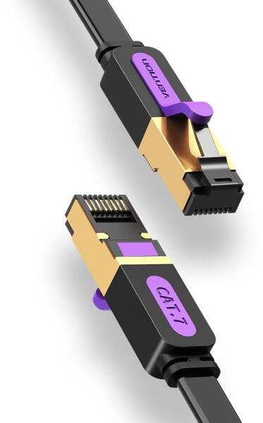 Cablu plat  Cat 7 cu doi conectori RJ45. Cu acest cablu de retea obtineti internet de mare viteza. Conectorii sunt placati cu aur, care asigura o transmisie fara a deranja semnalul de internet. Specificatii: CAT 7 Conector: RJ45 Contacte de cristal: Placat cu aur Conductor: cupru fara oxigen Viteza de transmisie: 10 GB / s Latime de banda: 600 MHz 28 AWG